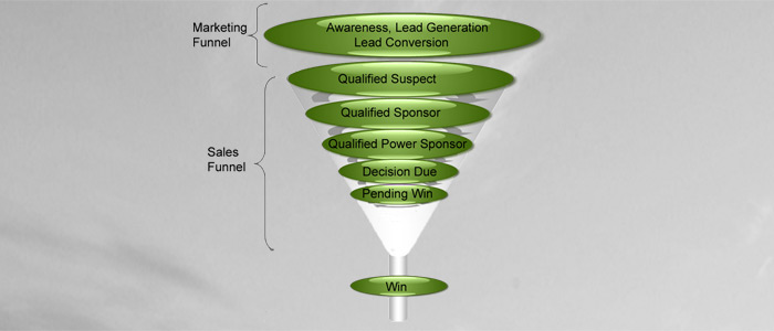 A Marketing Funnel may therefore be added above the Sales funnel. The exact breakdown of the Marketing and Sales Funnels will vary depending on the nature of the customer buying process. In general for B2B, the Marketing Funnel moves the target market members to Awareness, To Lead and To Converted Lead which then becomes an Opportunity for development by Sales. In Small Sales Teams, with no specialized Marketing help, this may well be all done by the sales team.
