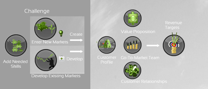 The availablity of needed skills and experience is necessary to create the platform for business growth. The investment necessary to move a good idea forward will not be available if the request is not compelling. Equally execution may not be efficient or effective if not guided by appropriate skills and experience. The challenge may be to Enter New Markets. This may be to Begin Growth, to "Sow the Seed" i.e. launching from a new idea or the lab to first (early adopter) customers or to Establish Growth i.e. launching from first customers to the mainstream market. Or the challenge may be to Develop Markets. This may be to "Optimize Growth" i.e.diagnosing impediments to growth and creating and delivering a solution to optimize.